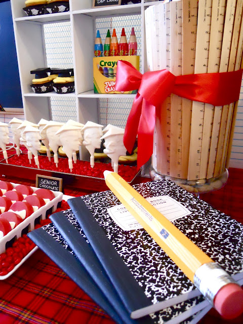 Congratulations class of 2012! My client for this school inspired dessert table had two grads to celebrate, one from high school, one from college. Since one school's colors were blue and gold and the other's was purple and gold, naturally I decided to run with red, black and yellow plaid! As you scroll through the images, I hope you enjoy all the school themed treats and props. Enjoy!